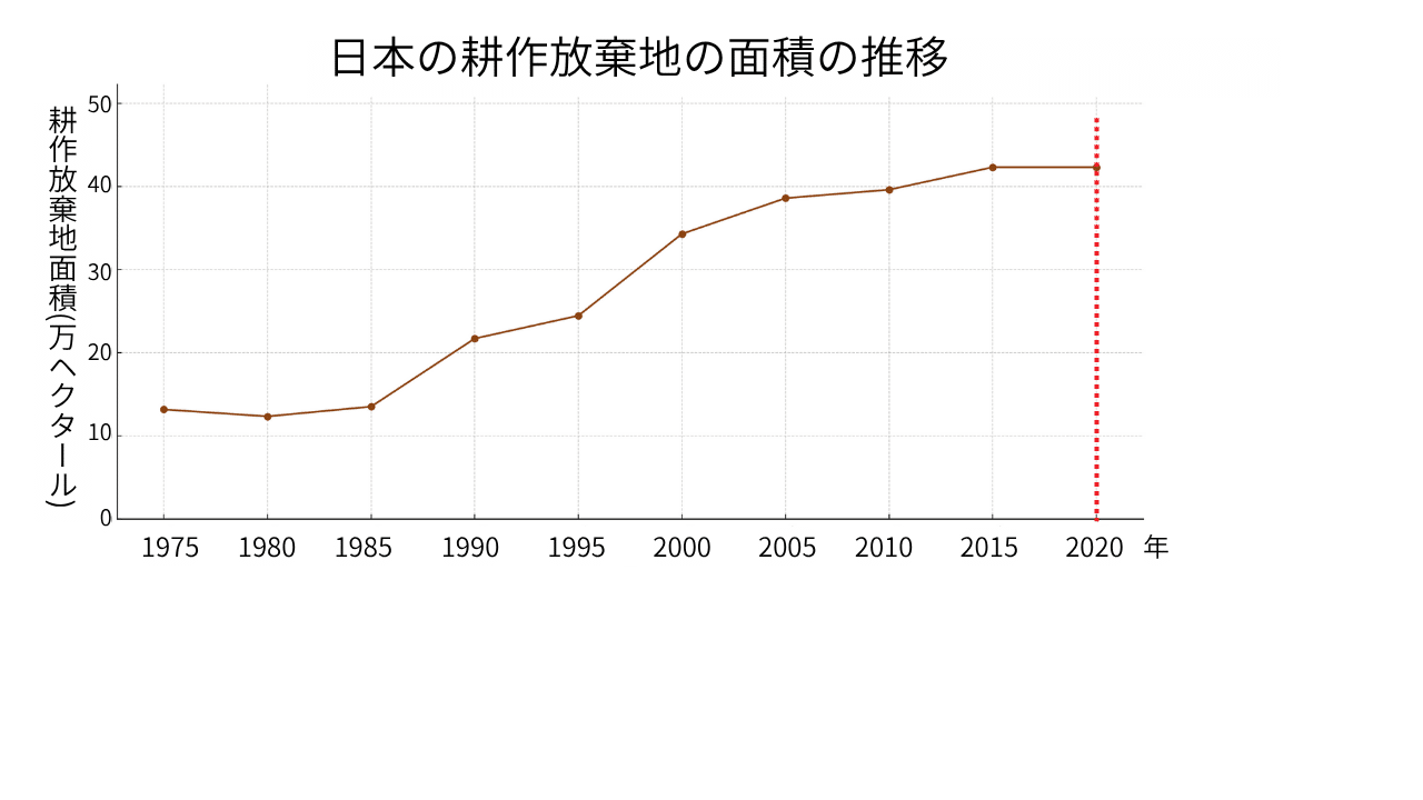 農林水産省のデータによると、50年前の1975年の耕作放棄地の面積は、13.1万ヘクタールだったものが、2000年には、約2.5倍の34.3万ヘクタールにまで増加します。