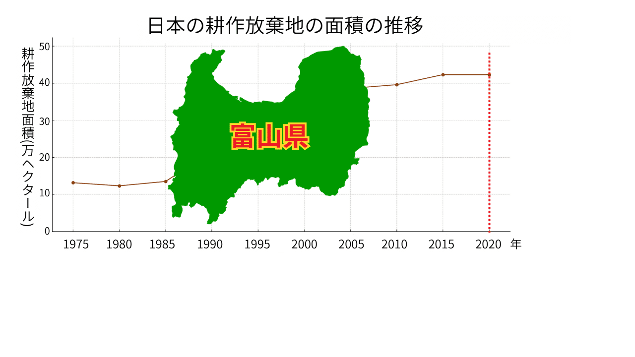 そして直近の2020年のデータでは、42.3万ヘクタールと、1975年の3倍となり、これは富山県の面積とほぼ同じです。