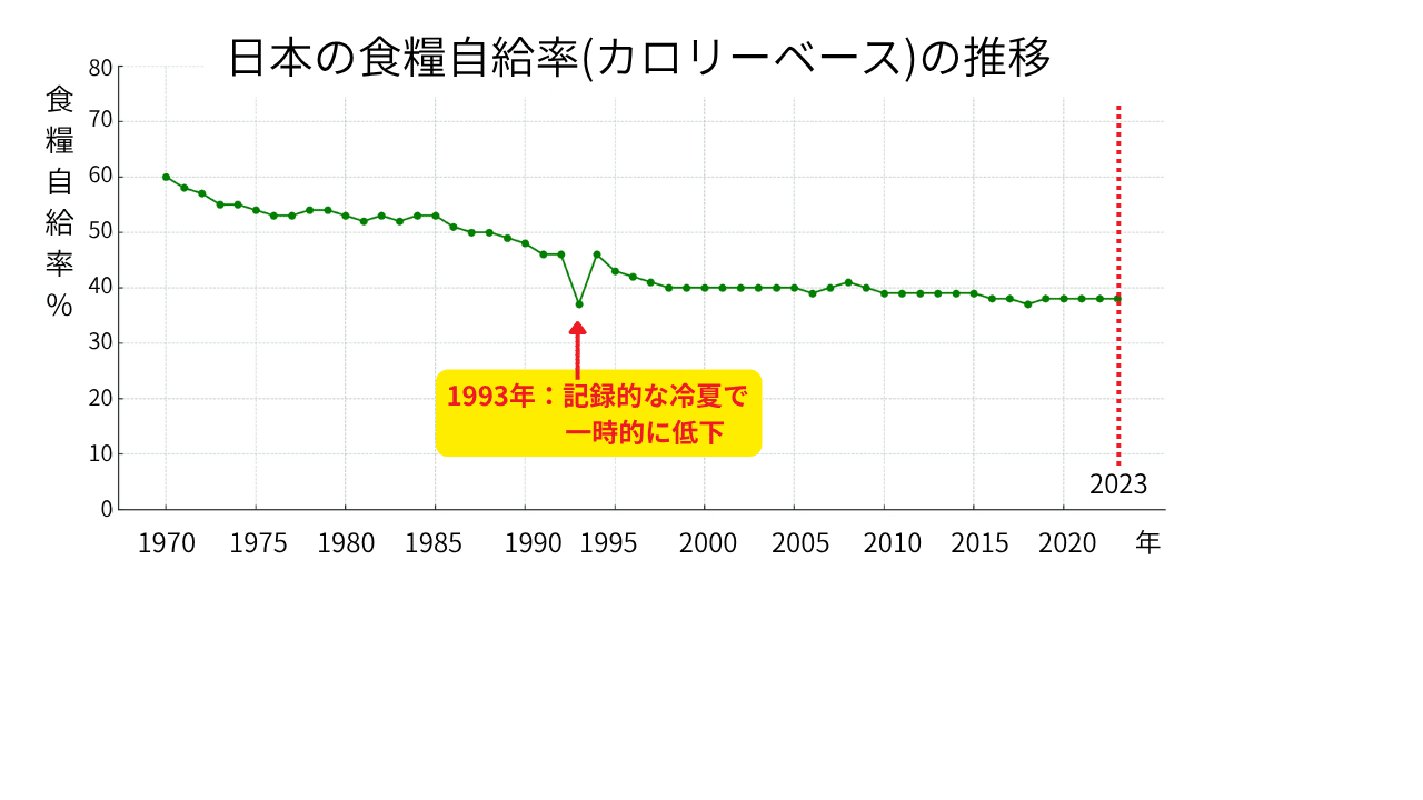 カロリーベースで見た食糧自給率は、1975年には54%だったものが、2000年には40%、直近の2023年には38%まで低下しています。