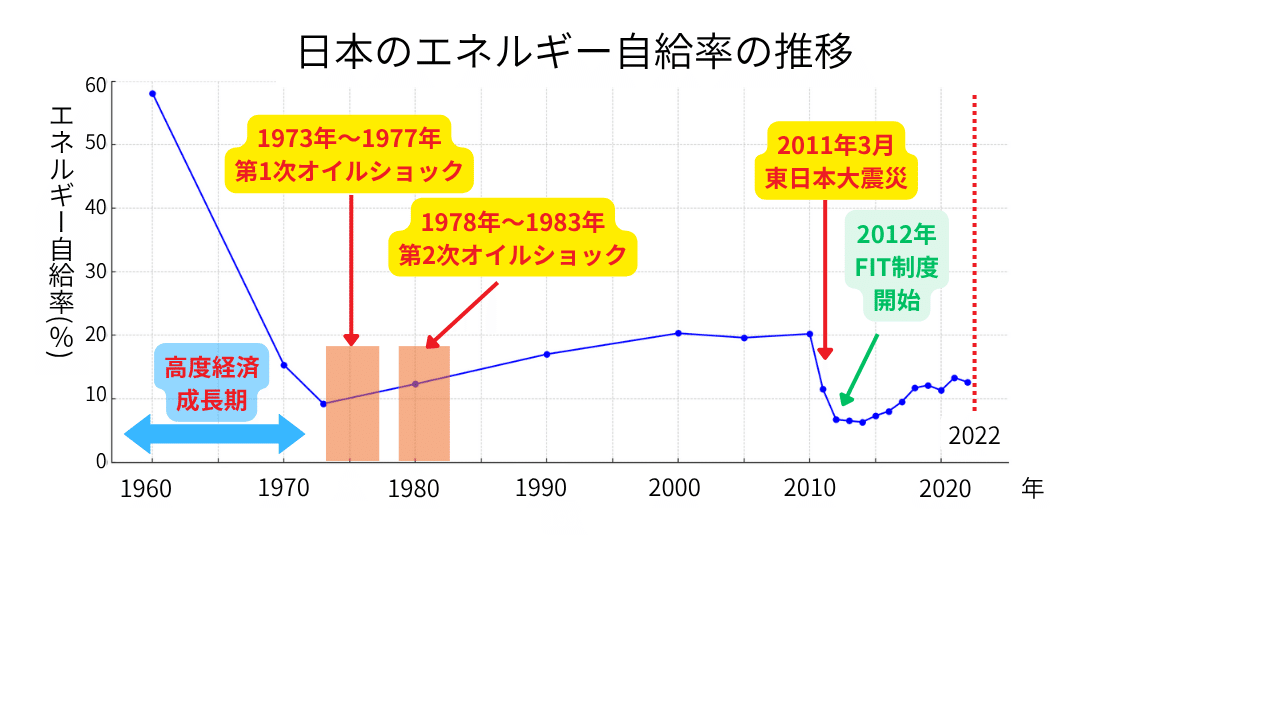 日本のエネルギー自給率は、高度経済成長期にさしかかる1960年の時点では、当時まだ国内で採れていた石炭や、豊富な水資源による水力発電により、58%を誇っていました。